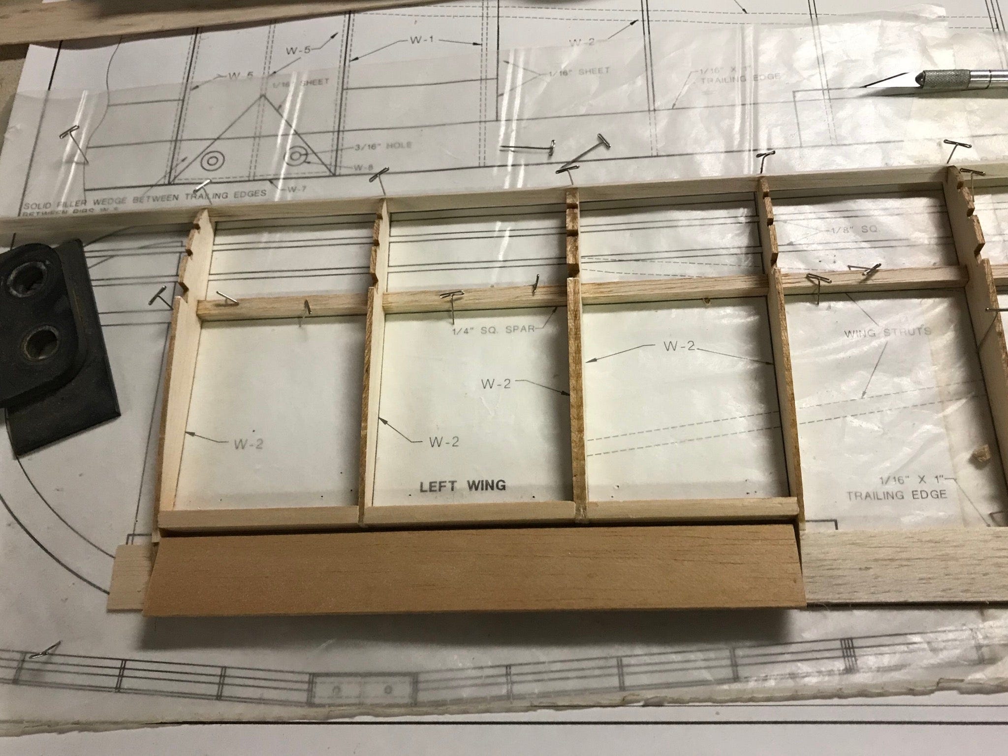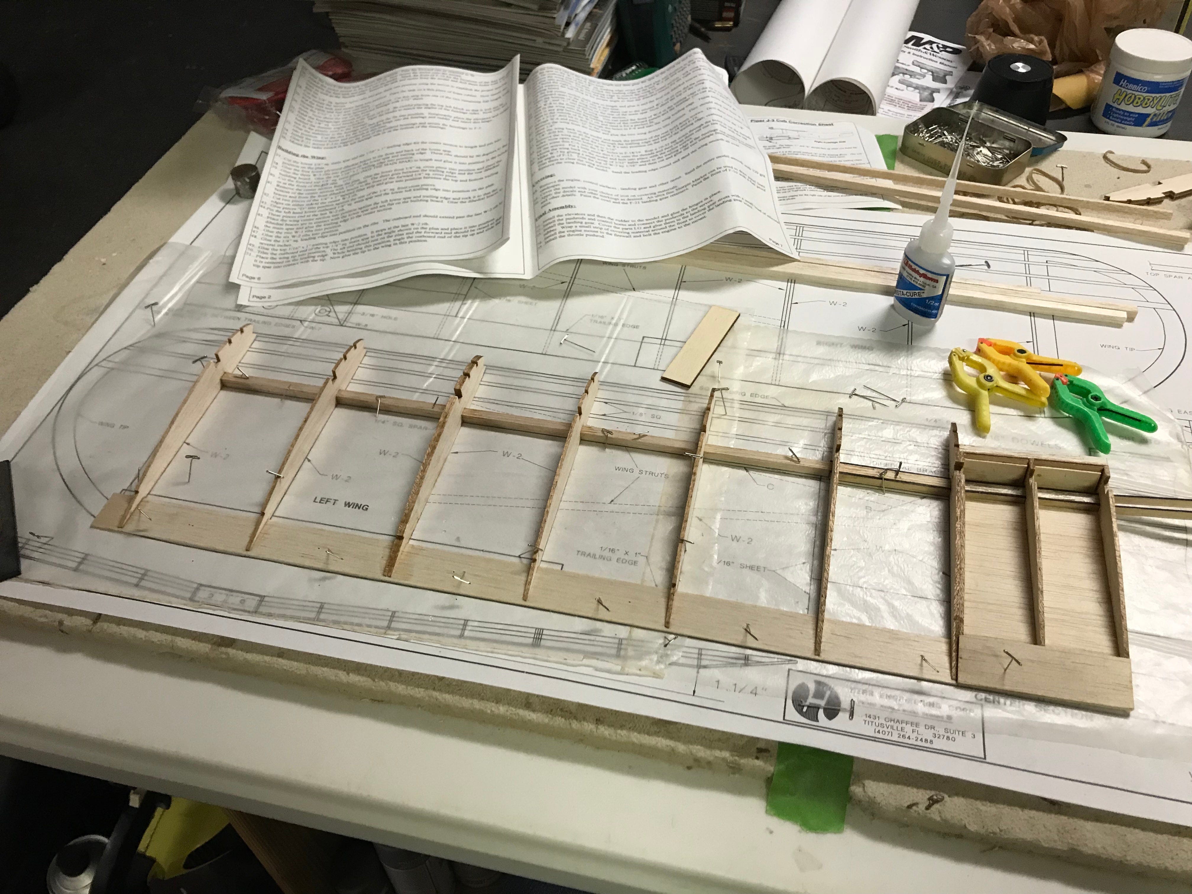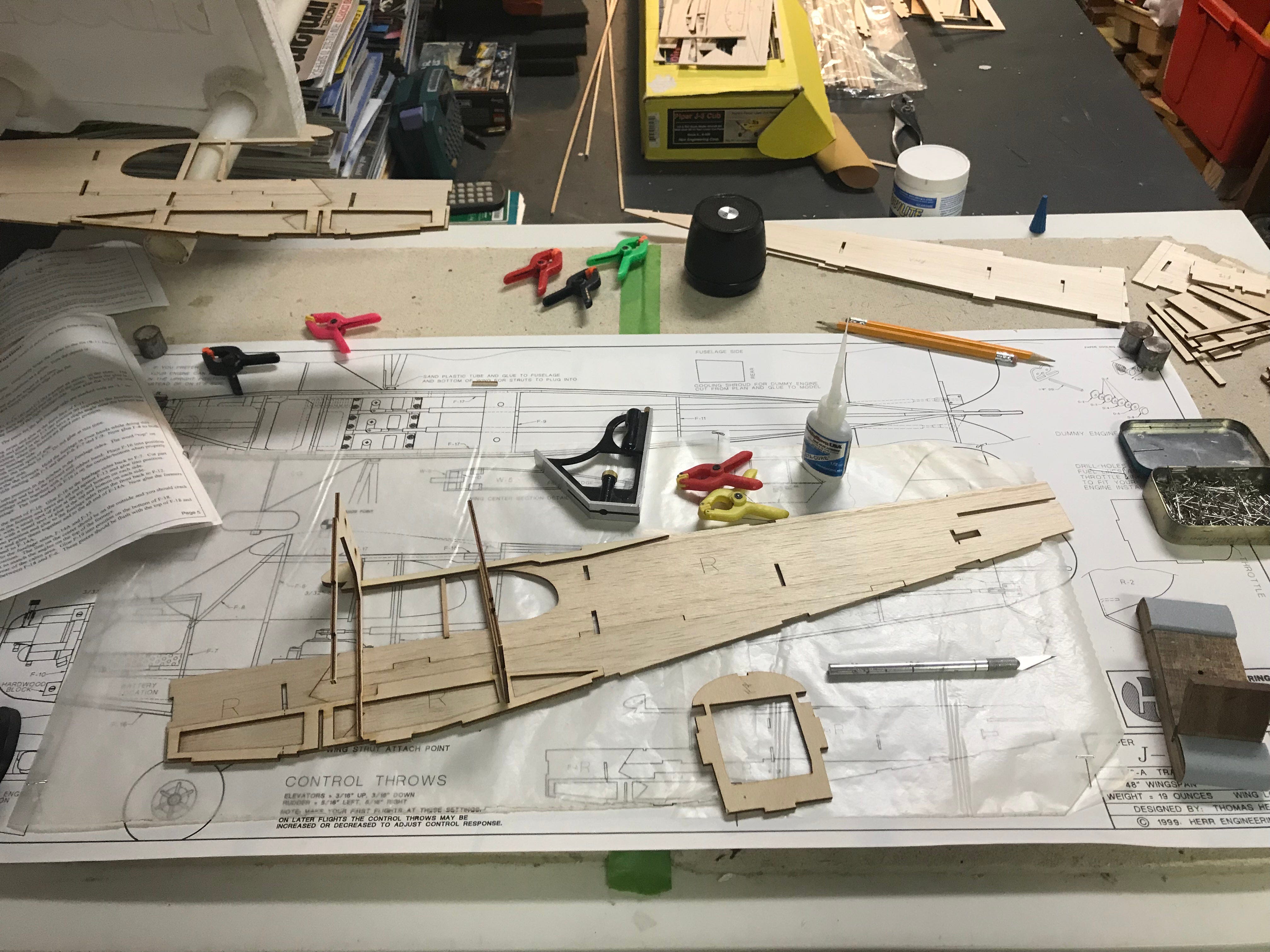 Parts like the ribs come precut. You setup the plans on cork or cardboard and put wax paper or plastic film over them to protect them from the super glue, then just build over them.