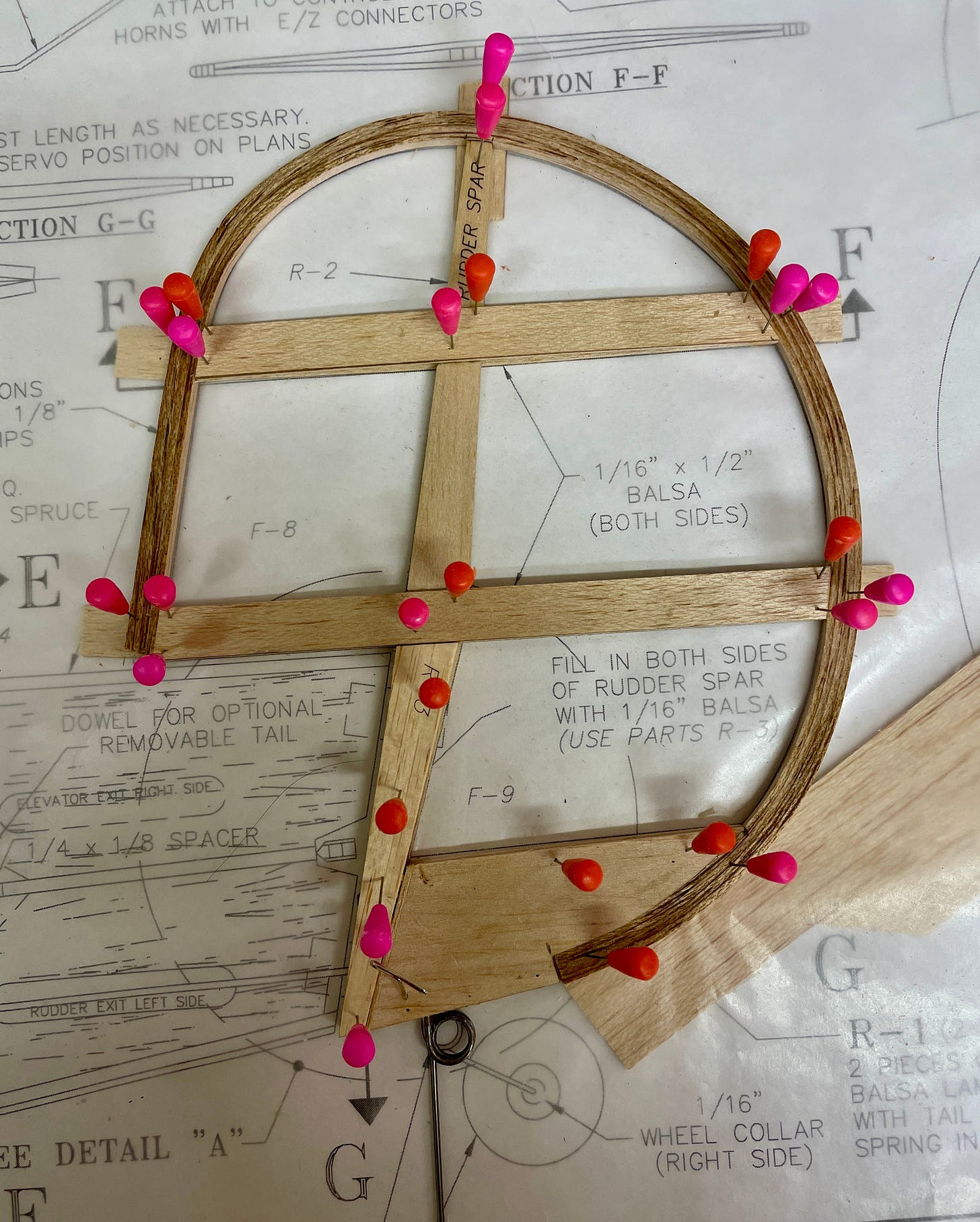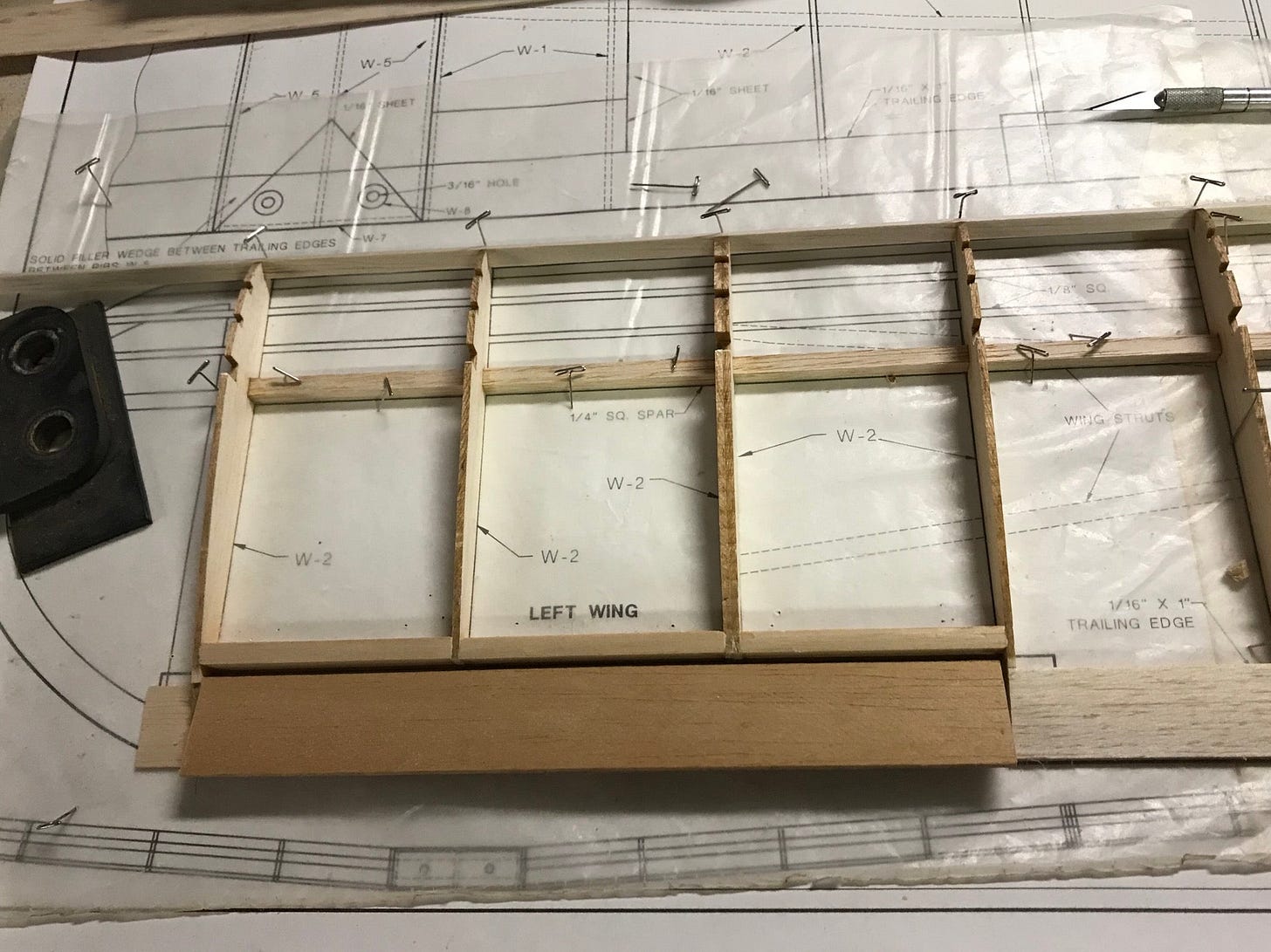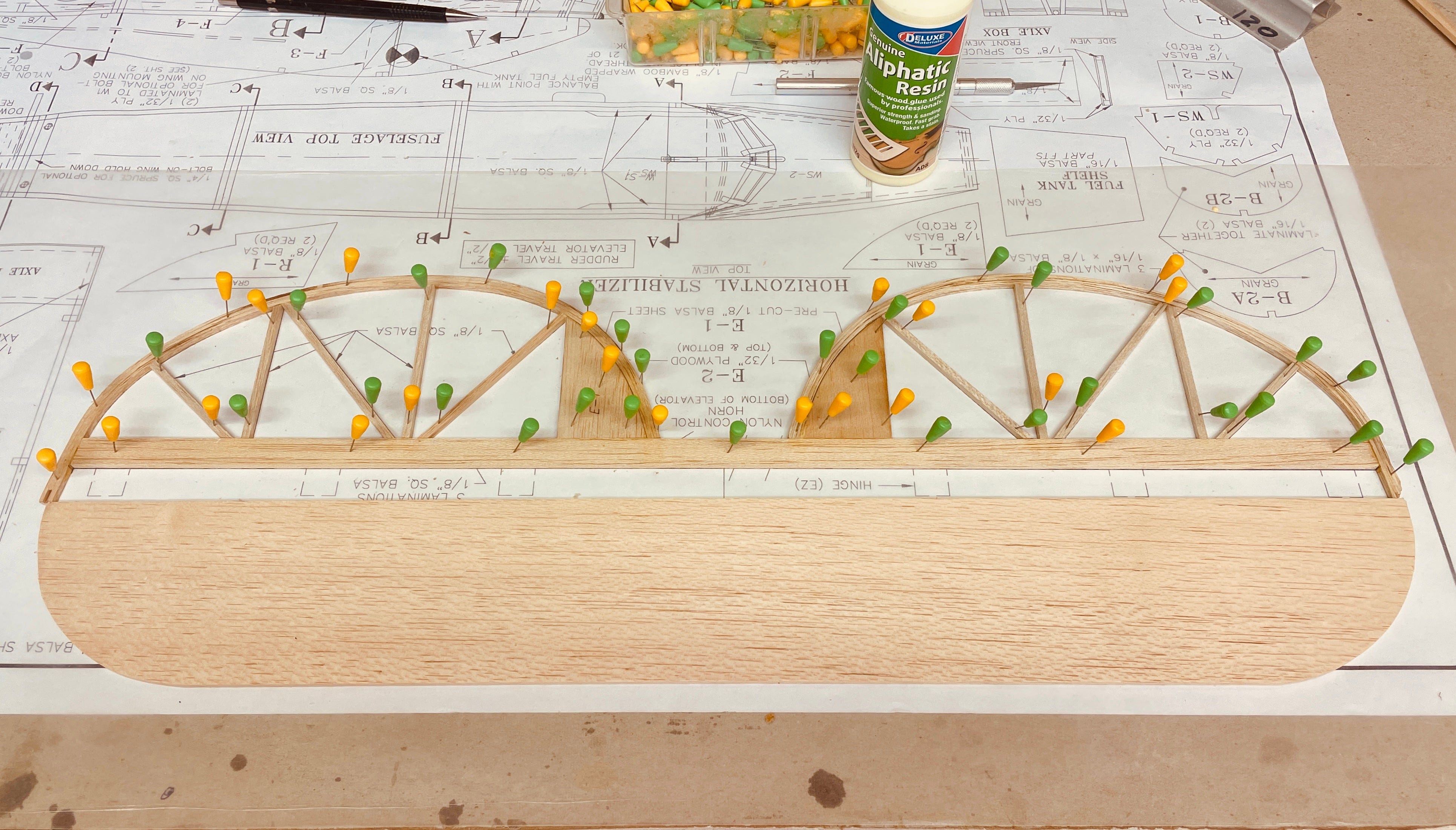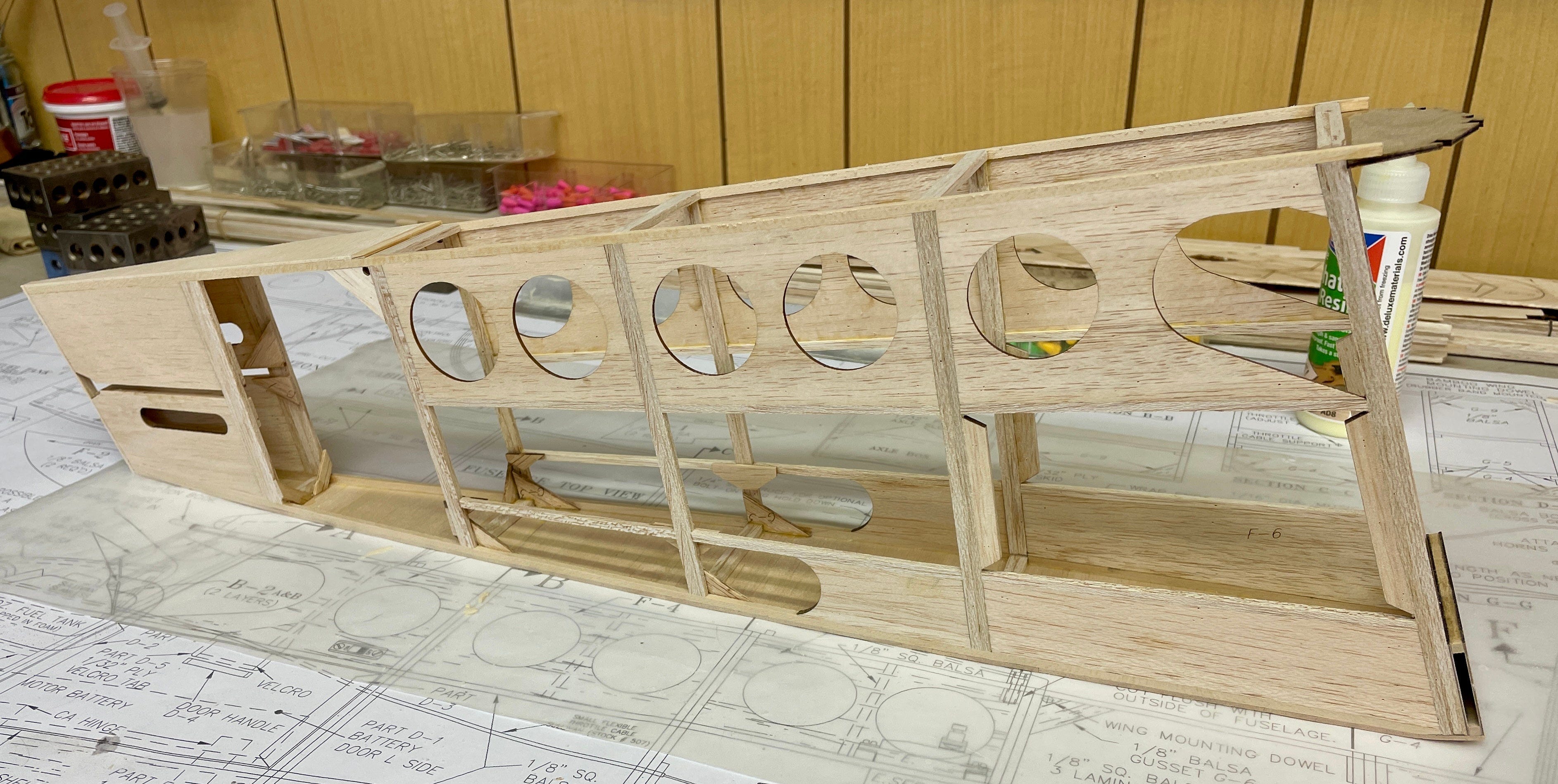 Parts like the ribs come precut. You setup the plans on cork or cardboard and put wax paper or plastic film over them to protect them from the super glue, then just build over them.