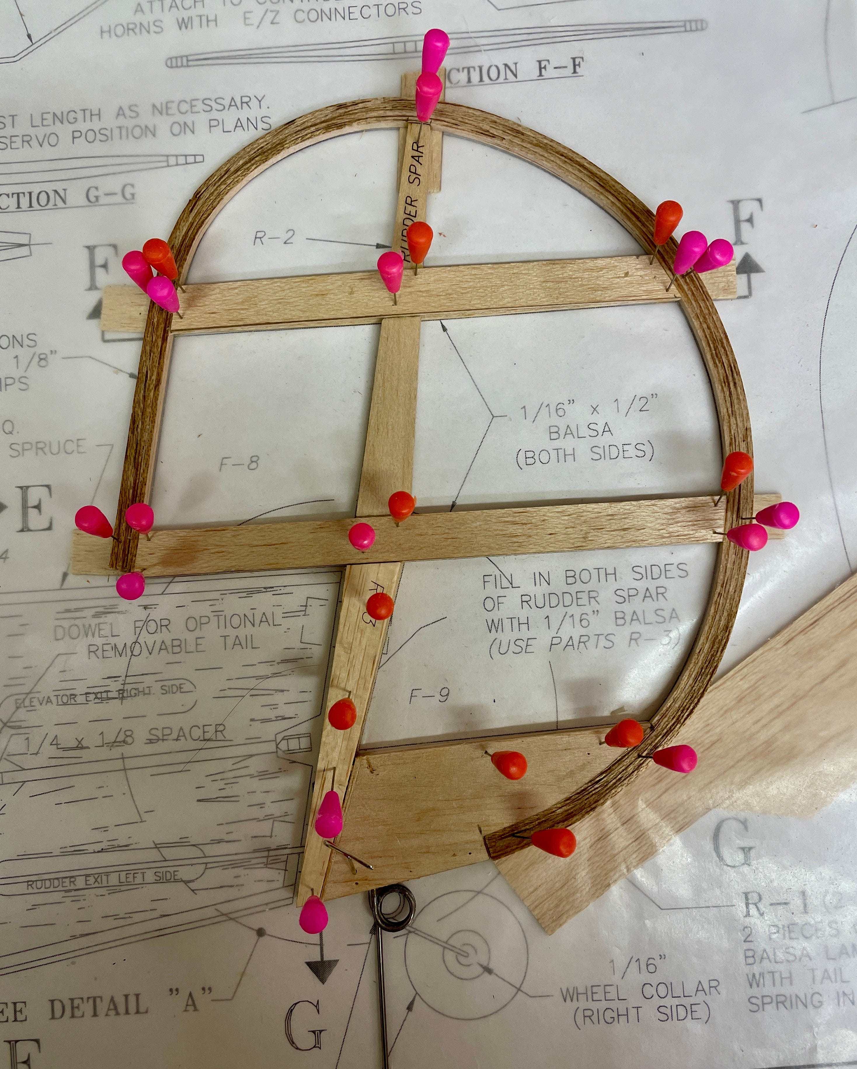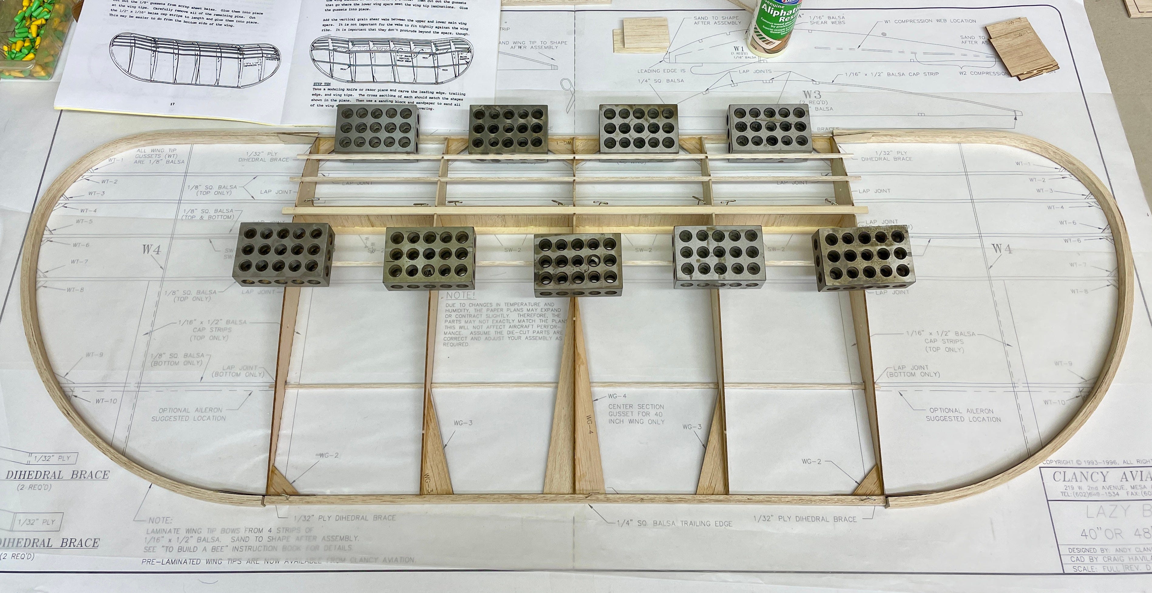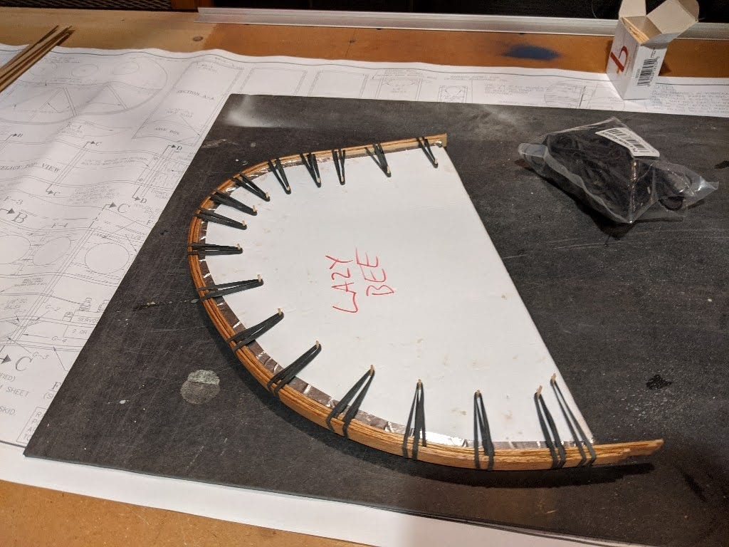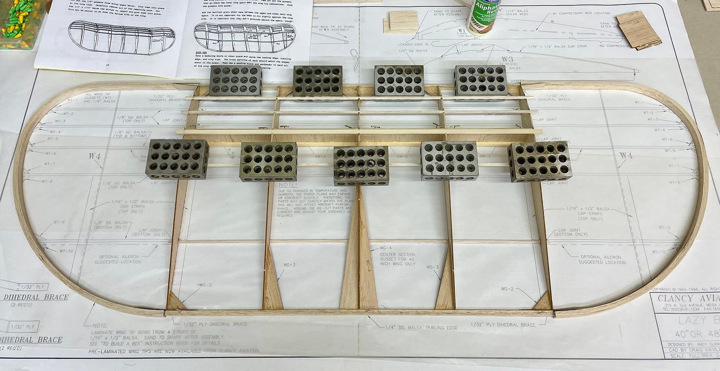 The leading and trailing edges are built from laminations. This gives the Bee some additional survivability at the cost of more complicated building. At the Flightest forums rockyboy shares his glue-up fixture for the wingtips.