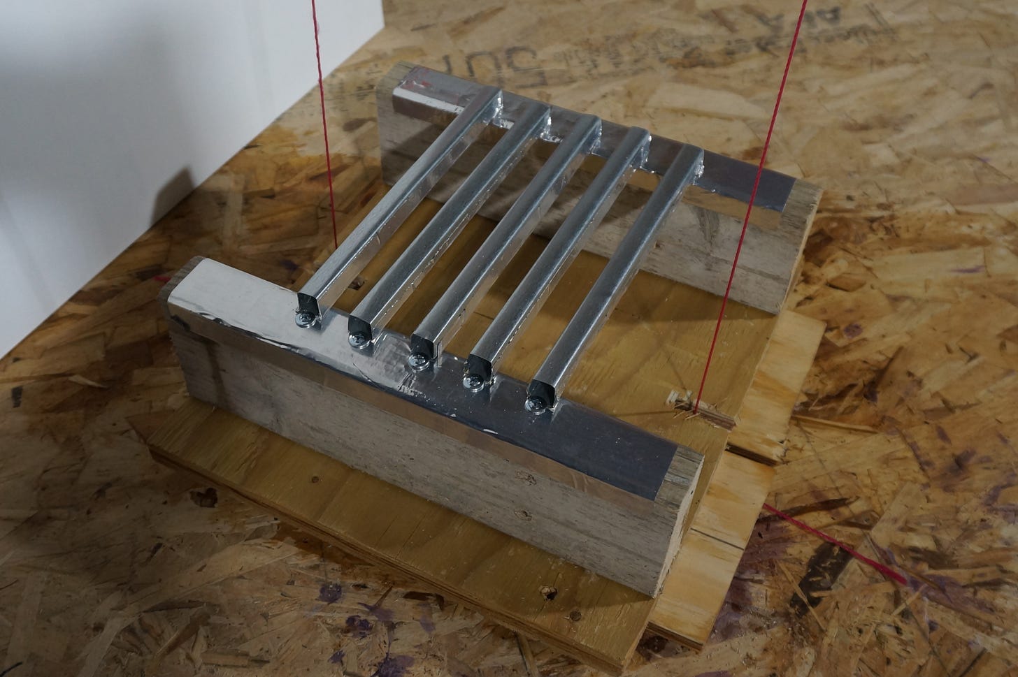 The pink string lines are used as guides for the falling 2 gal bucket and aluminum cylinder. This is where I messed up - the leading edge of the cylinder needs guides, in addition to the bucket. It didn’t hit dead center as intended: