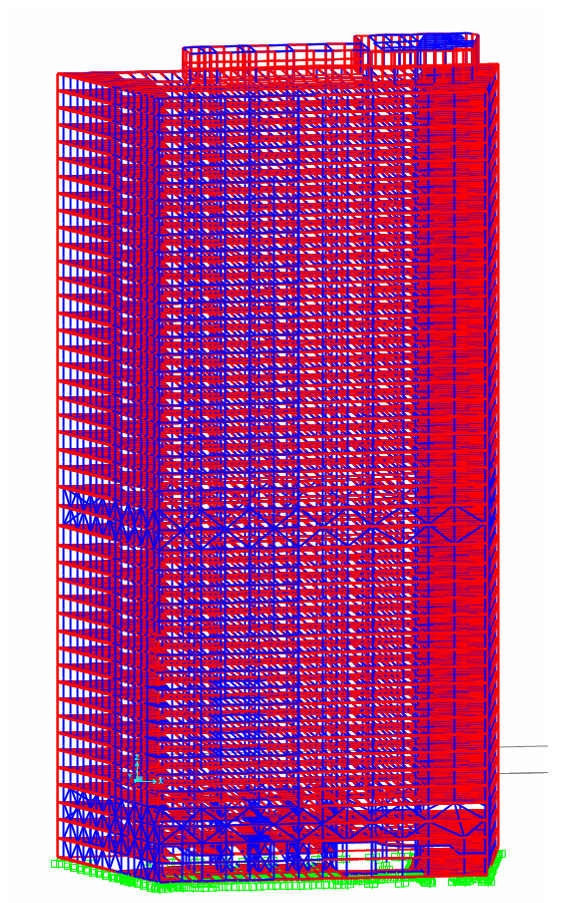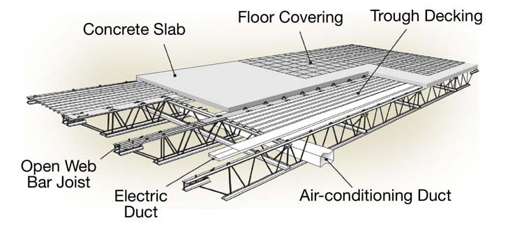 Floor System which used a combination of double trusses and single transverse trusses to carry the floor slabs and their gravity loads to the structural core and perimeter wall.