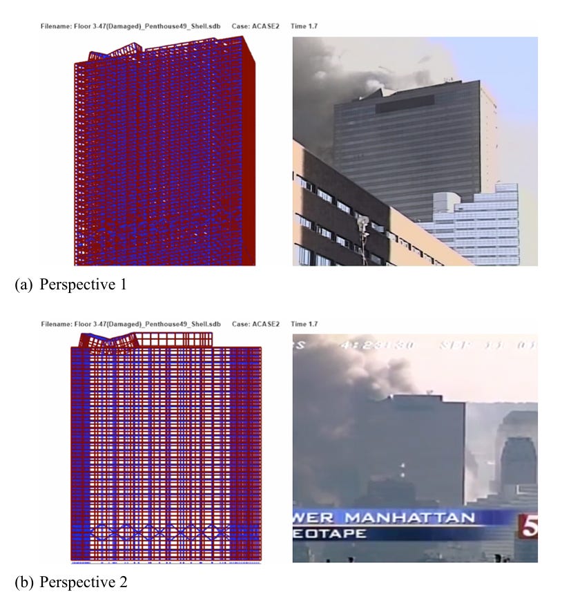 Based on this analysis, we found that the simultaneous failure of all core columns followed by the simultaneous failure of all exterior columns produces almost exactly the behavior observed in videos of the collapse.