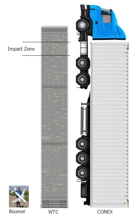 Even with the glancing blow, it’s pretty obvious from the results that a 767 fuselage traveling at 587 mph can immediately buckle the .25” thick columns of the WTC.