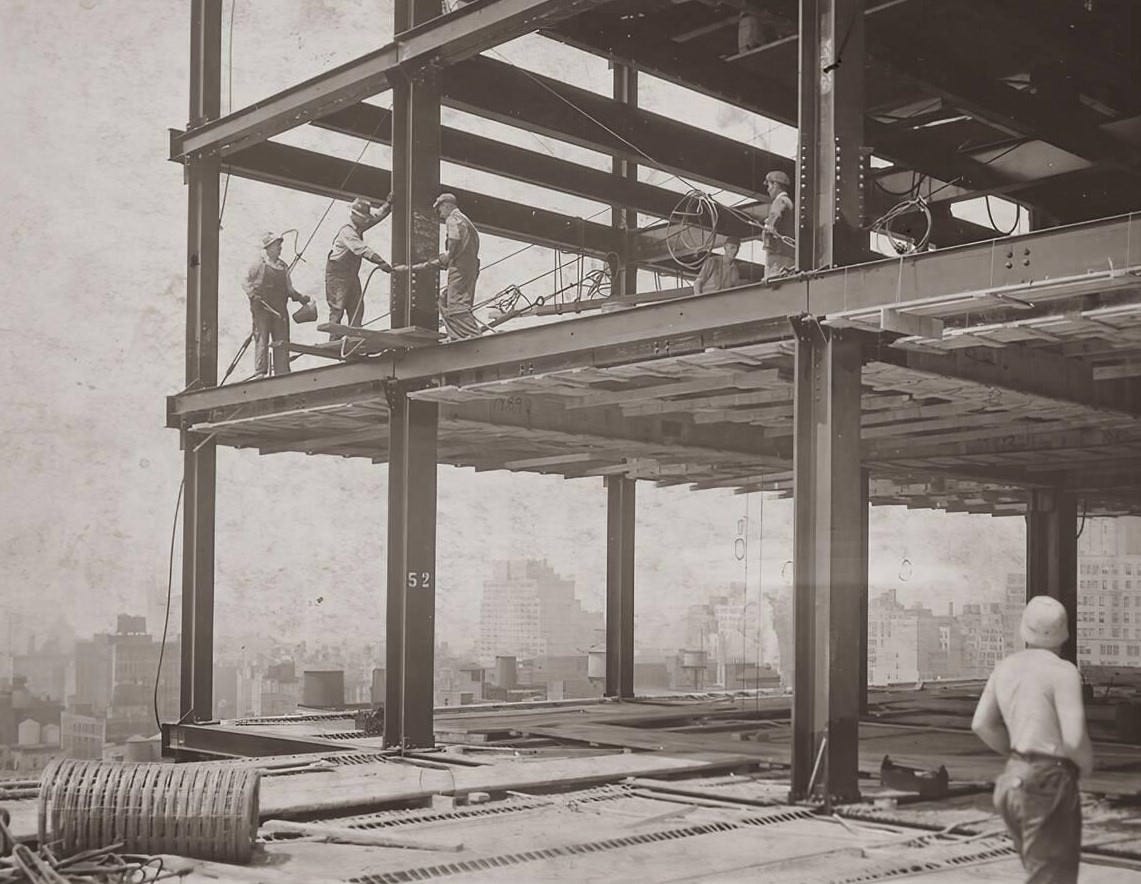 The Empire State Building uses a beam and girder structural system, with a curtain wall (non structural facade). This is less efficient past 30-40 stories because the bending loads (wind) are carried by the gussets between the beams and girders, not a dedicated shear wall.