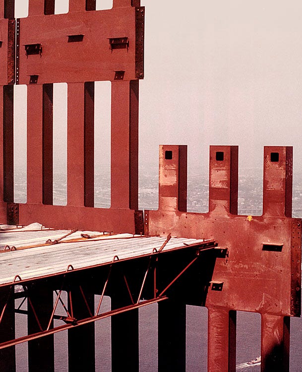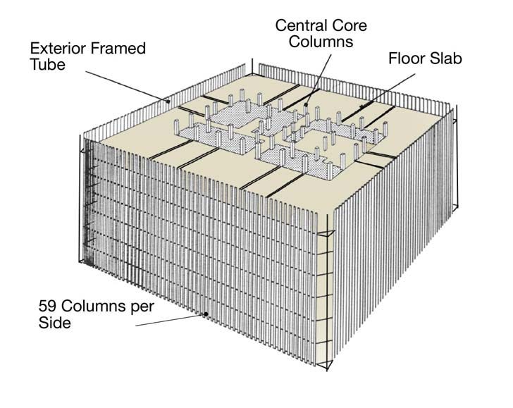 4. Because of its configuration, which is essentially that of a steel beam 209' deep, the towers are actually far less daring structurally than a conventional building such as the Empire State Building where the spine or braced area of the building is far smaller in relation to its height.
