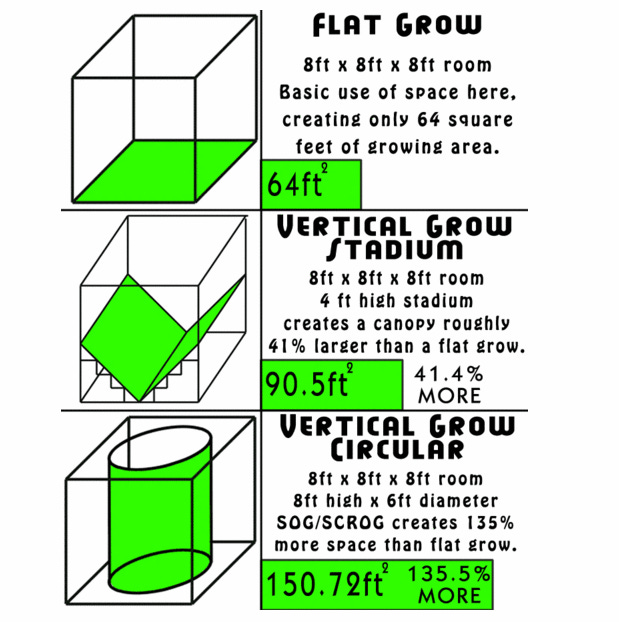 Vertical Growing is a pro technique where the light sits in the middle of the plants, which are trained to grow around it in a cylindrical shaped canopy. In my experience it has several advantages over a flat grow: