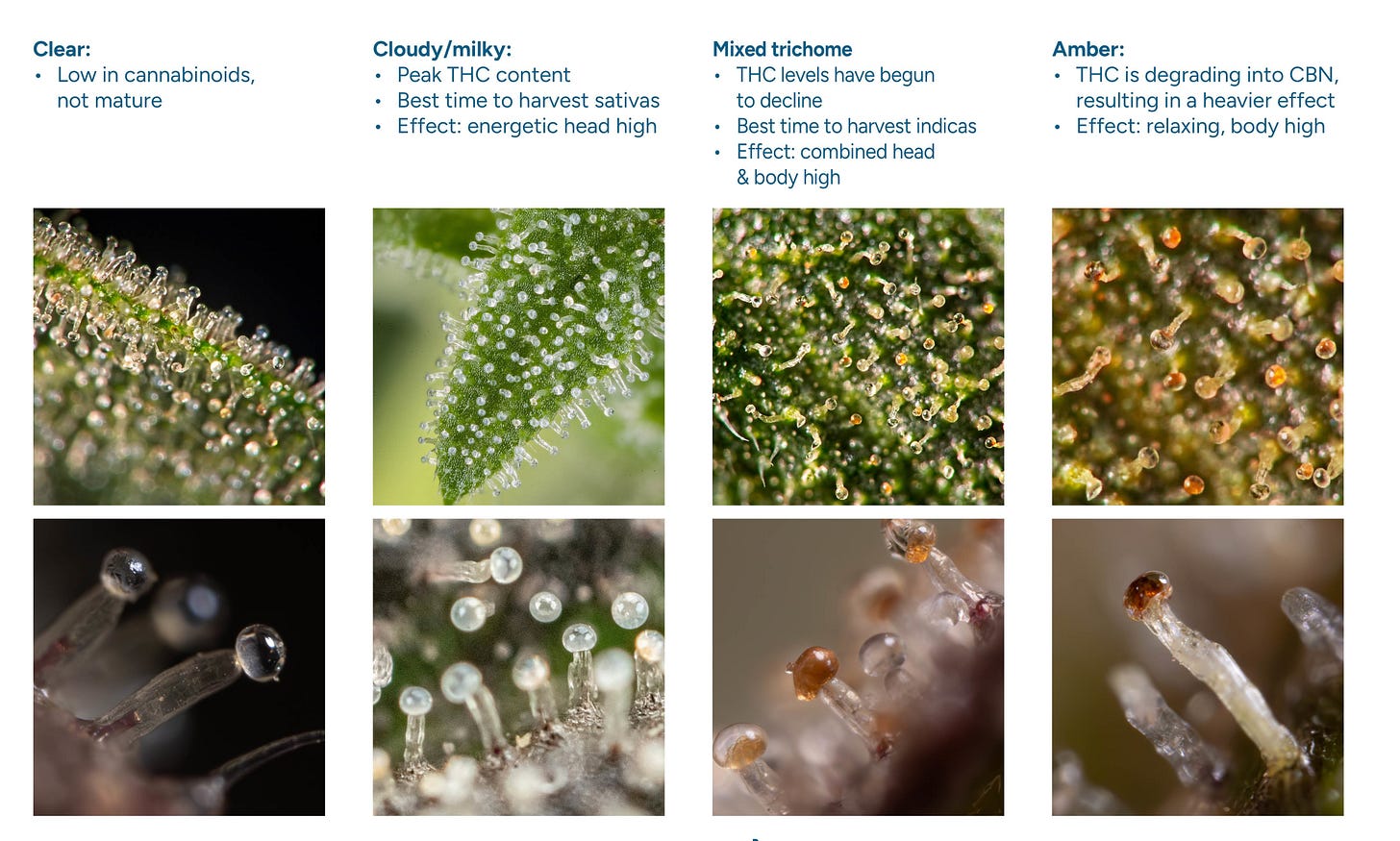 After they flower for about 1 month they are getting close to harvest. This can take substantially longer for some Sativas. The key here is to watch the trichomes. I like to harvest when they are cloudy but this is a personal taste thing. If you are doing hydroponics it is a good idea to swap the nutrient mix out for straight water for the last 1-2 weeks. This is called flushing.
